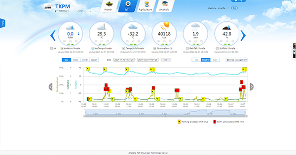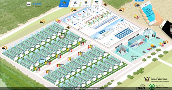 在砂拉越州的智慧農業示范區里,約40畝地里布局著40個大棚,這些大棚從外觀上看起來,沒什么特別的,但內里卻大有乾坤。仔細去看,大棚里,每一個種植地塊上都鏈接著托普云農智能傳感器,傳感器實時在線采集土壤溫濕度、土壤養分、光照強度等等數據。而這些數據,又在托普的物聯網系統上得以展示,為砂拉越州的作物生長提供良好環境,也為水肥施用、科學種養提供數據支撐。