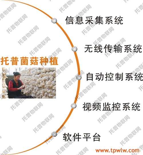 托普菌菇種植包括五大系統(tǒng):1.信息采集系統(tǒng)—可采集空氣溫濕度、土壤溫濕度、光照強度、二氧化碳強度等參數(shù);2.無線傳輸系統(tǒng)—可遠(yuǎn)程無線傳輸數(shù)據(jù);3.自動控制系統(tǒng)—包括噴灌、卷簾、風(fēng)機(jī)、加熱、補光等,達(dá)到作物適合生長環(huán)境;4.視頻監(jiān)控系統(tǒng)—查看作物實時生長情況、病蟲害防治和自動監(jiān)控功能;5.軟件平臺---遠(yuǎn)程數(shù)據(jù)實時查看參數(shù)和自動控制功能,各類報警功能等。