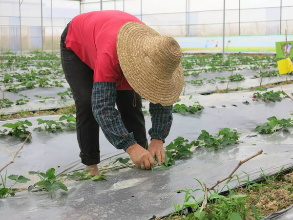 ??? 草莓苗木定植到長出花蕾后,逐株人工摘除過多老葉及子芽、腋芽;開花結果后再次摘除莖部變黃的老葉、枯葉,及時摘除匍匐莖,減少營養消耗,同時除去小分枝及弱小果,提高品質。