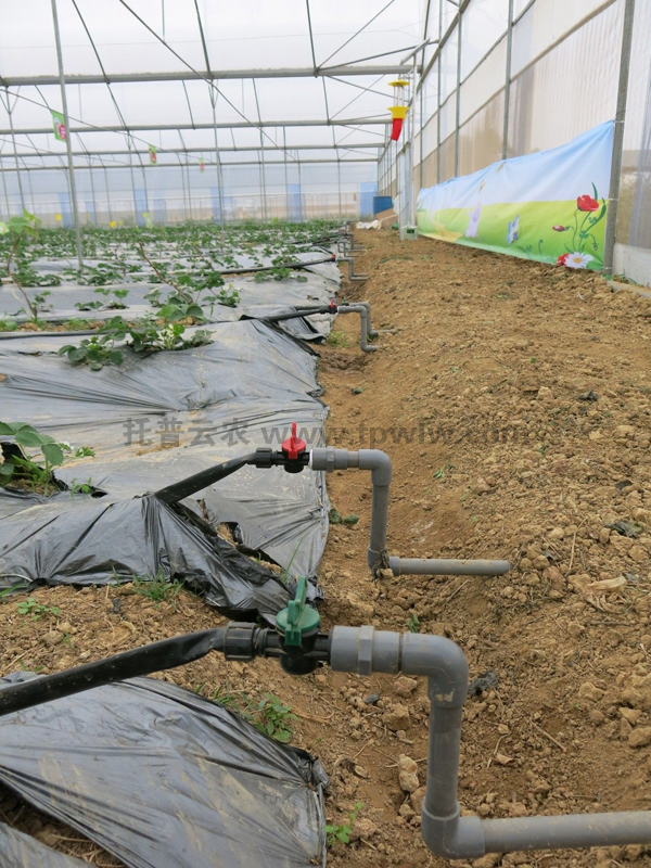 ??? 進入二次結果后,一些草莓出現脫肥現象。此時如果不加強養分供應,容易影響到二茬果的產量和品質。而且花期又不適宜經常噴施葉面施肥,為施肥增加了一定的難度。運用托普云農水肥一體化滴灌技術,將相應階段的有機肥溶于水中配成溶液,通過埋在土壤下的管道施肥,并在大棚內施放二氧化碳氣肥,有效提高光合作用,及時補充草莓所需的大量多元微量元素。