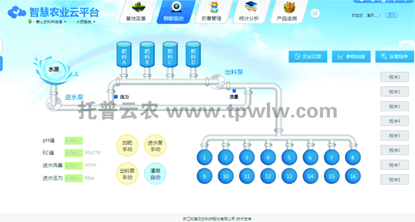 玉米適宜的土壤pH為5~8,以PH6.5~7.0最適。耐鹽堿能力差,特別是氯離子對玉米危害大。而通過施肥機精確的參數設置,可嚴格把控肥液的濃度以及PH值,為玉米提供最適宜的生長環境,同時用戶也可通過網頁或手機APP遠程查看水肥流量統計數據、園區視頻信息、控制田間電磁閥、進行在線專家咨詢,實現遠程智能化管理。