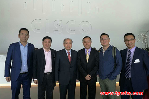 周國(guó)輝廳長(zhǎng)(左三)、陳渝陽(yáng)董事長(zhǎng)(右一)一行在思科