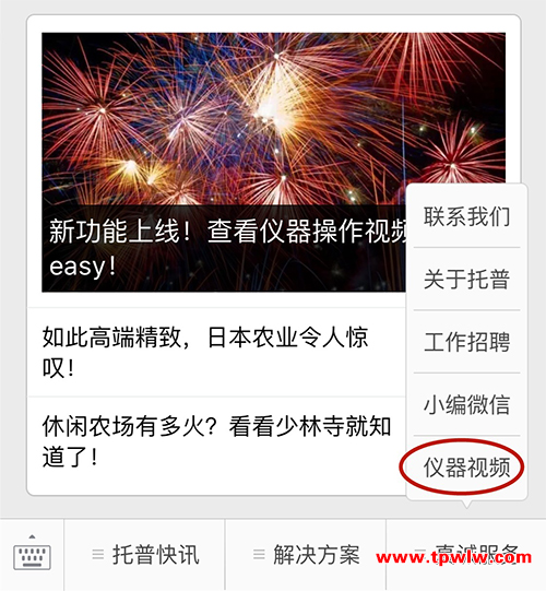 在“浙江托普云農(nóng)科技股份有限公司”微信號的菜單欄也提供了查看視頻的入口,只需要選擇“真誠服務(wù)”→“儀器視頻”即可進入頁面查看。