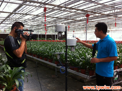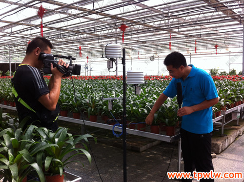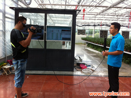 記者:所謂物聯網,其實簡單的說就是物物相連,互相感知。大家看我身后的一組探頭(托普儀器固定式無線農業氣象綜合監測站),包括這個是測量溫度的,這個是測量土壤墑情的,上面還有測量二氧化碳濃度的,測量光照強度的。那這些測量數據都會上傳到我身后的中央控制室內的計算機里,通過計算機的計算,再控制風扇、噴灌…這些設備的運轉。