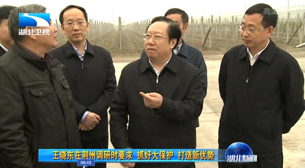 11月17日,湖北衛視《湖北新聞》以《王曉東在荊州調研時要求 抓好大保護 打造新優勢》為題,報道湖北省委副書記、省政府代省長王曉東在荊州調研時強調要認真學習貫徹十八屆六中全會精神,樹立新的發展理念,著力打造發展新優勢,走出一條生態優先、綠色發展的新路子。