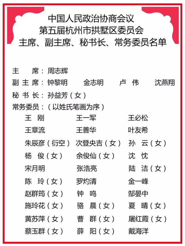(2017年1月9日政協(xié)第四屆杭州市拱墅區(qū)委員會常務(wù)委員會第29次會議通過)(以姓氏筆畫為序)