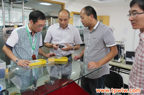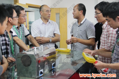 圖為:嘉善縣農經局科教科郁新偉科長(著白色衣服)與眾人一起討論儀器相關知識
