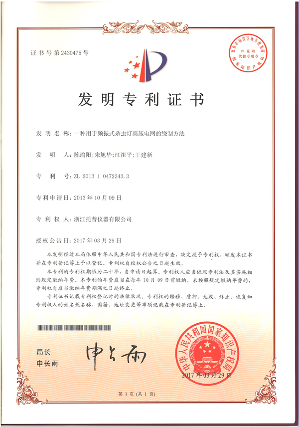 - 托普云農又喜獲發明專利發表日期:2017-04-14 來源:托普云農 瀏覽次數:4438次近日,我司托普云農又喜獲一項發明專利。據悉,該發明專利名稱為“一種用于頻振式殺蟲燈高壓電網的繞制方法”,發明專號為ZL201310472343.3。相較于傳統的殺蟲燈繞制方法,“一種用于頻振式殺蟲燈高壓電網的繞制方法”是一種用專門設計的螺旋繞線機實現殺蟲燈高壓電網繞線的方法。該發明專利于2013年10月9日向國家知識產權局申請,并于2017年3月29日正式得到授權。據業內專家評價,該專利由于電網間距由螺桿螺距保證,使得繞制后的電網間距均勻一致。此外,繞制方法操作方便,繞制效率高且繞線緊致不易松落造成短路,具有良好的普及運用價值。