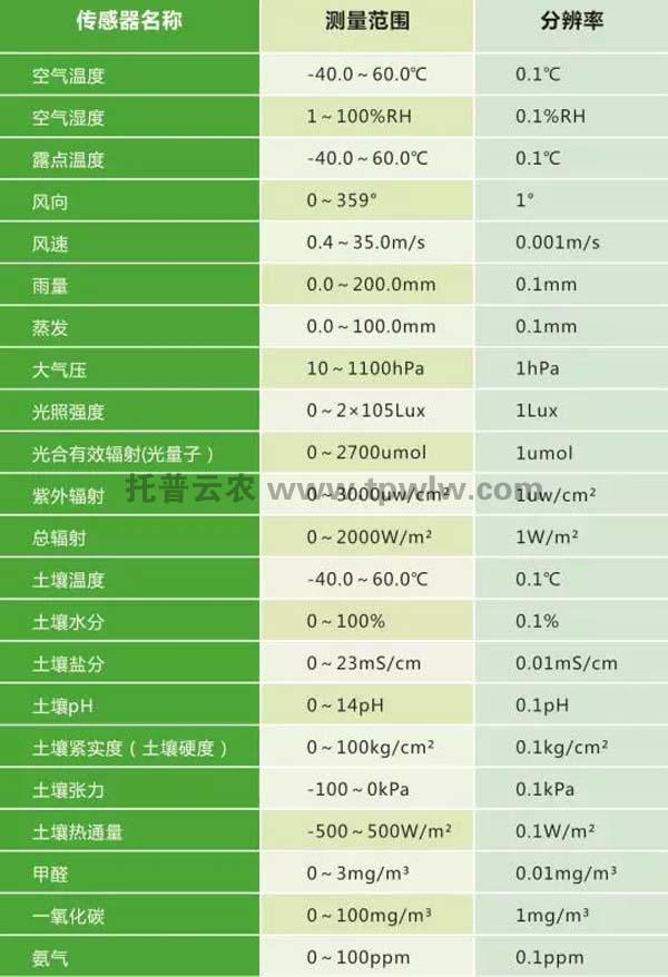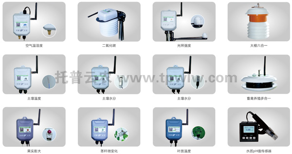 在農(nóng)業(yè)氣象方面,目前有空氣溫度、濕度、光照強度、光合有效輻射、二氧化碳、雨量、蒸發(fā)、風速風向、大氣壓、總輻射、紫外輻射等傳感器。同時,還有應(yīng)用于畜禽養(yǎng)殖監(jiān)測的氨氣、硫化氫等傳感器,應(yīng)用于水質(zhì)監(jiān)測的pH、余氯、濁度、溶解氧、氨氮、水溫等傳感器,應(yīng)用于環(huán)境監(jiān)測的一氧化碳、二氧化碳、甲醛、PM2.5、PM10等傳感器。