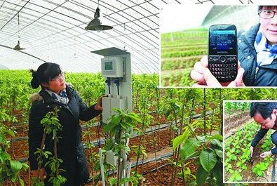 8月24日,管理員在山東省濟南市歷城區唐王鎮高智能溫室大棚內查看智能型農業環境通用采集控制器、展示手機召喚短信。近日,一個由太陽能供電的物聯網農業信息化高智能溫室大棚在唐王鎮建成啟用。該溫室大棚根據不同植物生長條件設定參數,利用棚內設置的氣象百葉箱及光照度、二氧化碳和土壤水分等多個探頭,定時將數據信息傳輸給控制系統,及時對棚內進行調節。如遇到大風、大雨等惡劣天氣超過設定參數時,便會通過手機進行短信報警,實現了遠程監控,確保棚內植物“幸福”茁壯成長。