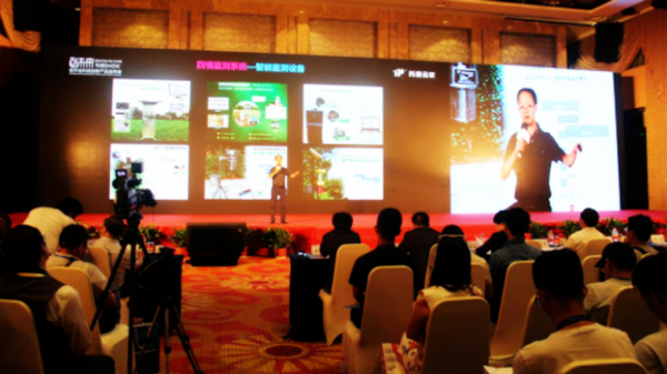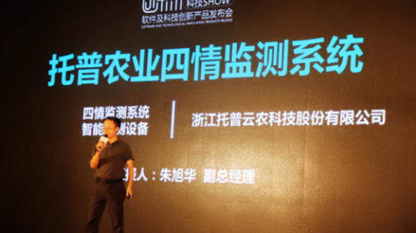 托普云農副總經理朱旭華在“創未來”軟件及科技創新產品發布會上介紹農業四情監測系統