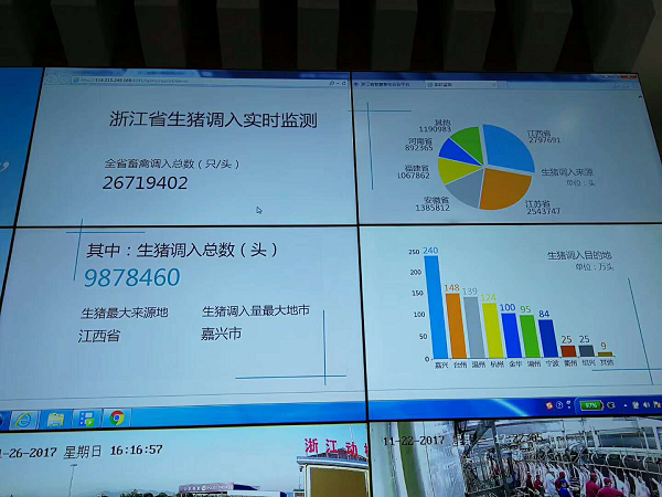 本屆農(nóng)博會信息化元素顯著,重點(diǎn)展出農(nóng)業(yè)數(shù)據(jù)庫建設(shè)、農(nóng)業(yè)智慧管理、追溯體系建設(shè)、農(nóng)產(chǎn)品電子商務(wù)發(fā)展。在農(nóng)博會上,由托普云農(nóng)子公司浙江森特信息技術(shù)有限公司為浙江省畜牧獸醫(yī)局研發(fā)的浙江省智慧畜牧云平臺也亮相現(xiàn)場。 動(dòng)態(tài)在線監(jiān)管,實(shí)時(shí)顯示豬舍、消毒通道、屠宰車間等畫面。