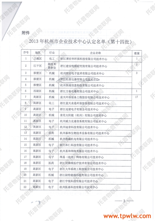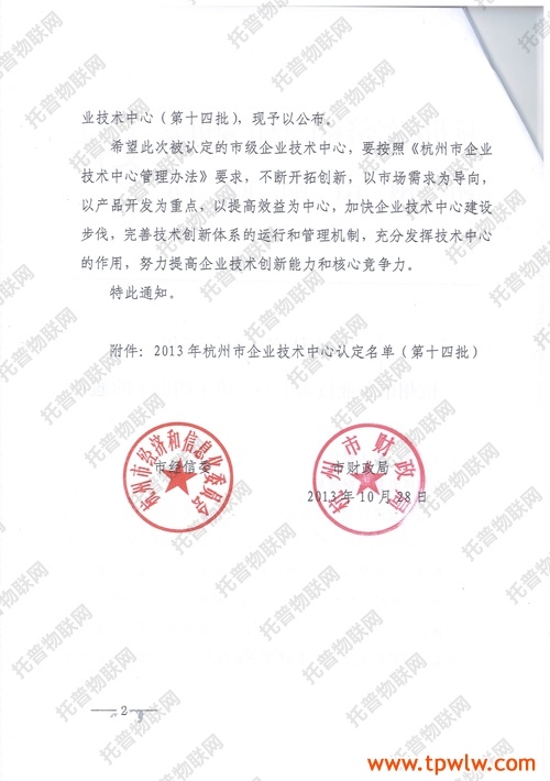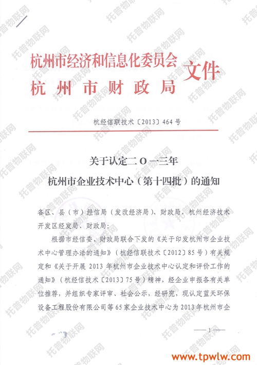 經企業申報各有關單位推薦,并組織專家評審、社會公示、經杭州市經信委和財政局研究認定浙江托普儀器有限公司等65家企業技術中心為2013年杭州市企業技術中心(第十四批)。