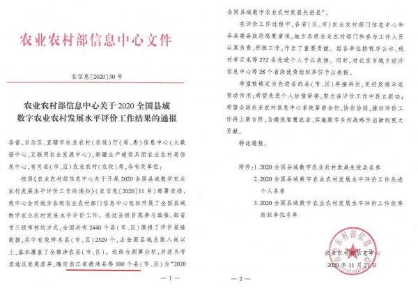我國已持續多年開展縣域數字農業農村發展水平評價工作,這已經成為推動縣域數字農業農村發展的有力杠桿。2020年底,由農業農村部市場與信息化司會同農業農村部信息中心共同發布的《2020全國縣域數字農業農村發展水平評價報告》(以下簡稱“報告”)顯示,2019年全國縣域數字農業農村發展總體水平達36.0%,較上年提升3個百分點。報告還確定德清縣等100個縣(市、區)為“2020全國縣域數字農業農村發展先進縣”,成為各地數字鄉村建設的“風向標”。其中,德清縣在全國2400多個縣(市、區)中以總分全國第一的成績脫穎而出,連續兩年獲此殊榮。