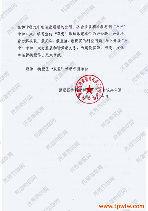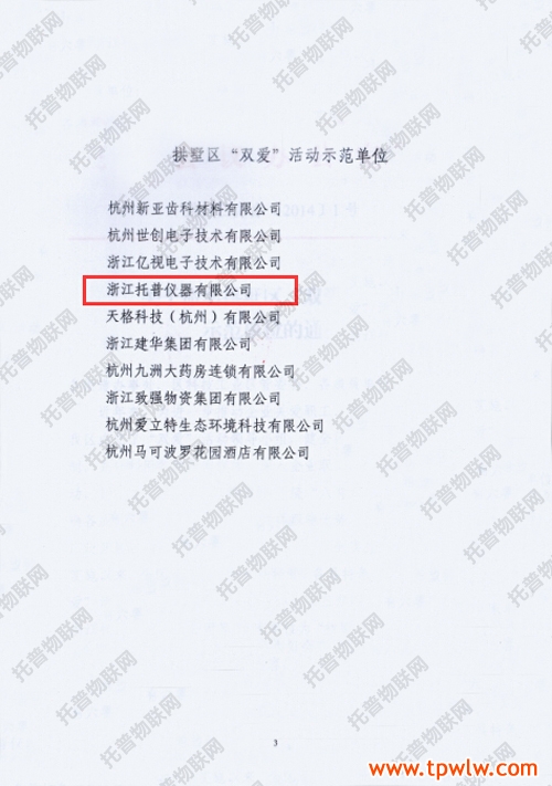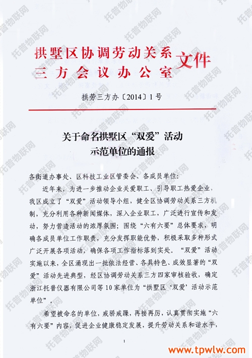 近日,《關(guān)于命名拱墅區(qū)“雙愛”活動示范單位的通報》文件頒布,托普儀器被評選為拱墅區(qū)“雙愛”活動示范單位。