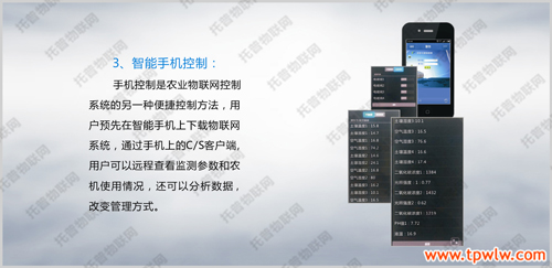 通過物聯網系統可連接傳感器采集土壤溫度、濕度、養分含量(N、P、K)、PH值、降水量、空氣溫濕度、氣壓、光照強度等來獲得作物生長的適宜條件,并根據參數變化實時調控或自動控制溫控系統、灌溉系統等;