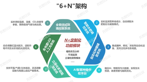 該方案基于"6+N"架構(gòu)構(gòu)建:全密閉式環(huán)境控制系統(tǒng)精準(zhǔn)調(diào)控溫濕度及CO?濃度,隔絕外界干擾;全光譜LED光系統(tǒng)動態(tài)調(diào)整紅藍(lán)光配方適配作物生長周期;立體栽培系統(tǒng)通過平面、多層、氣霧模式靈活適配產(chǎn)能需求;智能水肥系統(tǒng)實時監(jiān)測營養(yǎng)液成分并自動調(diào)配灌溉;自動化設(shè)備實現(xiàn)播種、移栽、采收全流程無人化操作;AI中樞整合物聯(lián)網(wǎng)與大數(shù)據(jù),提供生長預(yù)測與病害預(yù)警;另可擴(kuò)展植物表型分析、環(huán)境監(jiān)測等N個定制模塊,形成閉環(huán)智能生產(chǎn)體系。